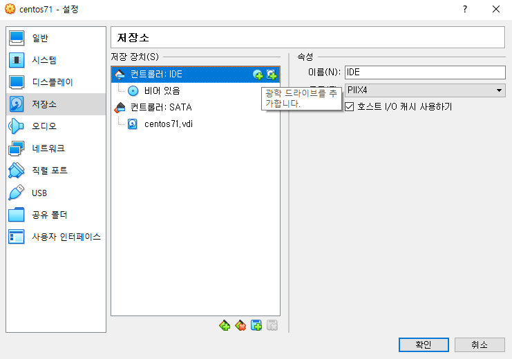 저장소 탭에서 컨트롤러 : IDE 옆에 시디아이콘(광학드라이브를 추가합니다)를 선택해줍니다.