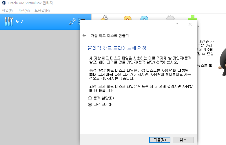 물리적 하드 드라이브에 저장에서 고정 크기를 선택하겠습니다.