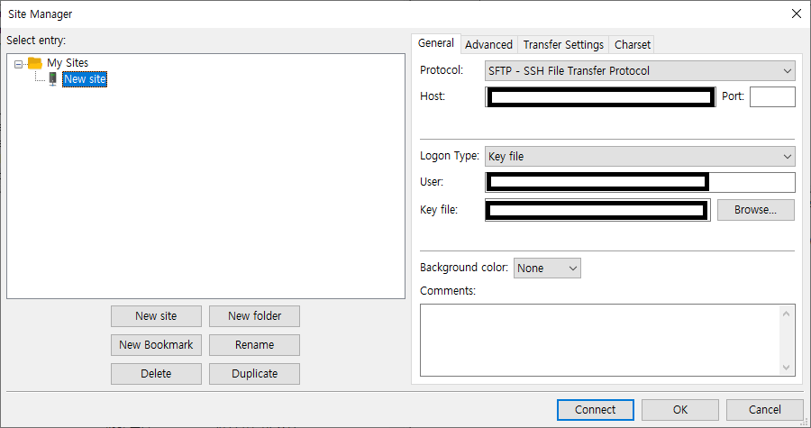 왼쪽 위 File 탭 - Site Manager 창에서 아래 그림과 같은 설정을 통해 ppk 파일로 접속할 수 있다.