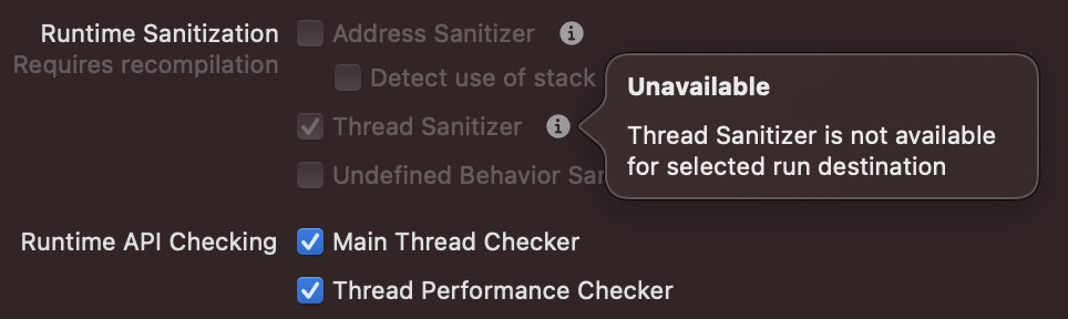 시뮬레이터를 선택하면 Thread Sanitizer 항목이 활성화된다.