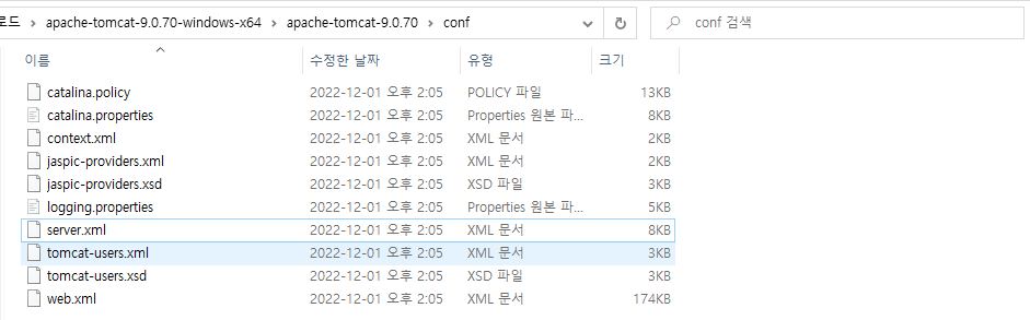 톰캣 프로그램의 conf 폴더로 이동합니다.