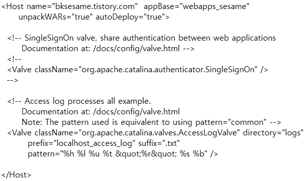 server.xml을 메모장으로 열었을 때, <Host> 태그로 묶여진 부분을 추가로 등록하면 됩니다.