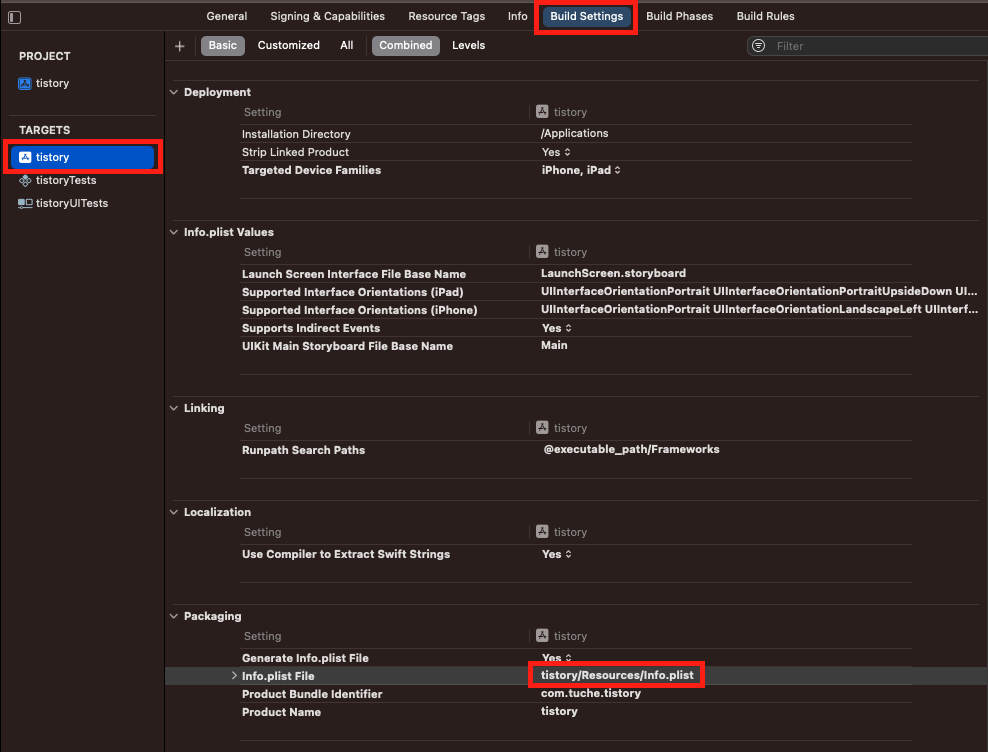 3. Packaging 탭 Info.plist File 세팅에서 파일 위치를 설정