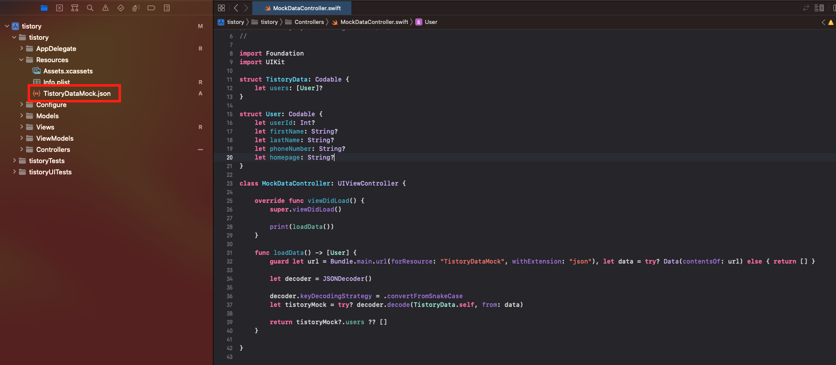 프로젝트에 있는 json 파일의 url 정보를 가져온 후, Data(contentOf:) 함수에서 파일의 데이터를 읽어옵니다.