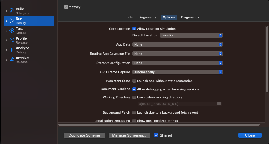 해결방법으로는 Edit Scheme -> Run 탭 -> Options 탭 -> CoreLocation 설정, DefaultLocation 설정을 합니다.