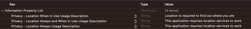 Info.plist 파일에 위와 같이 3가지 설정을 해줍니다.