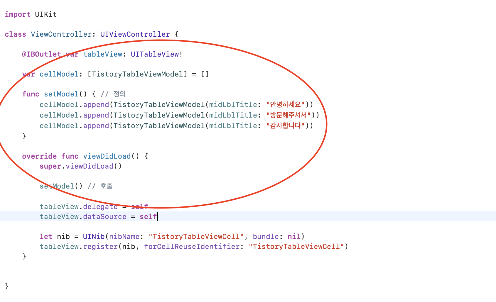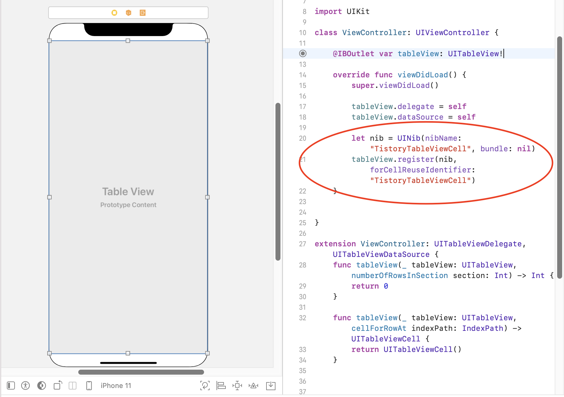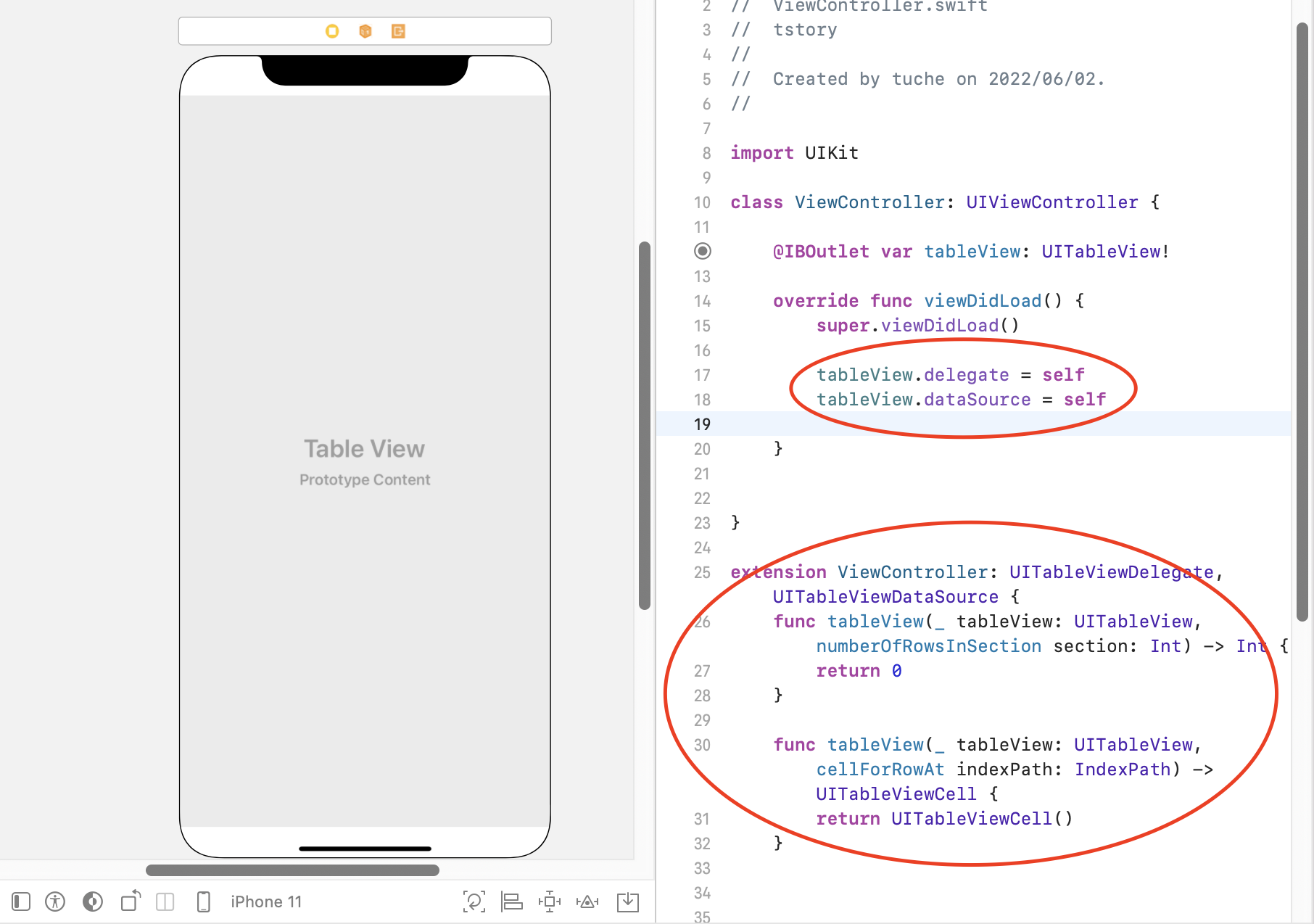코드에서 테이블뷰의 Delegate와 DataSource를 추가합니다.