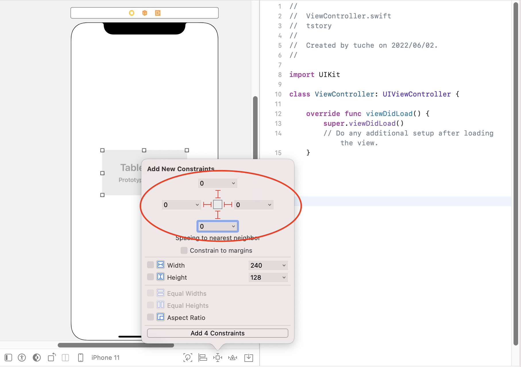 Contraint를 추가합니다. 네방향 0으로 설정하여 전체를 채워줍니다.
