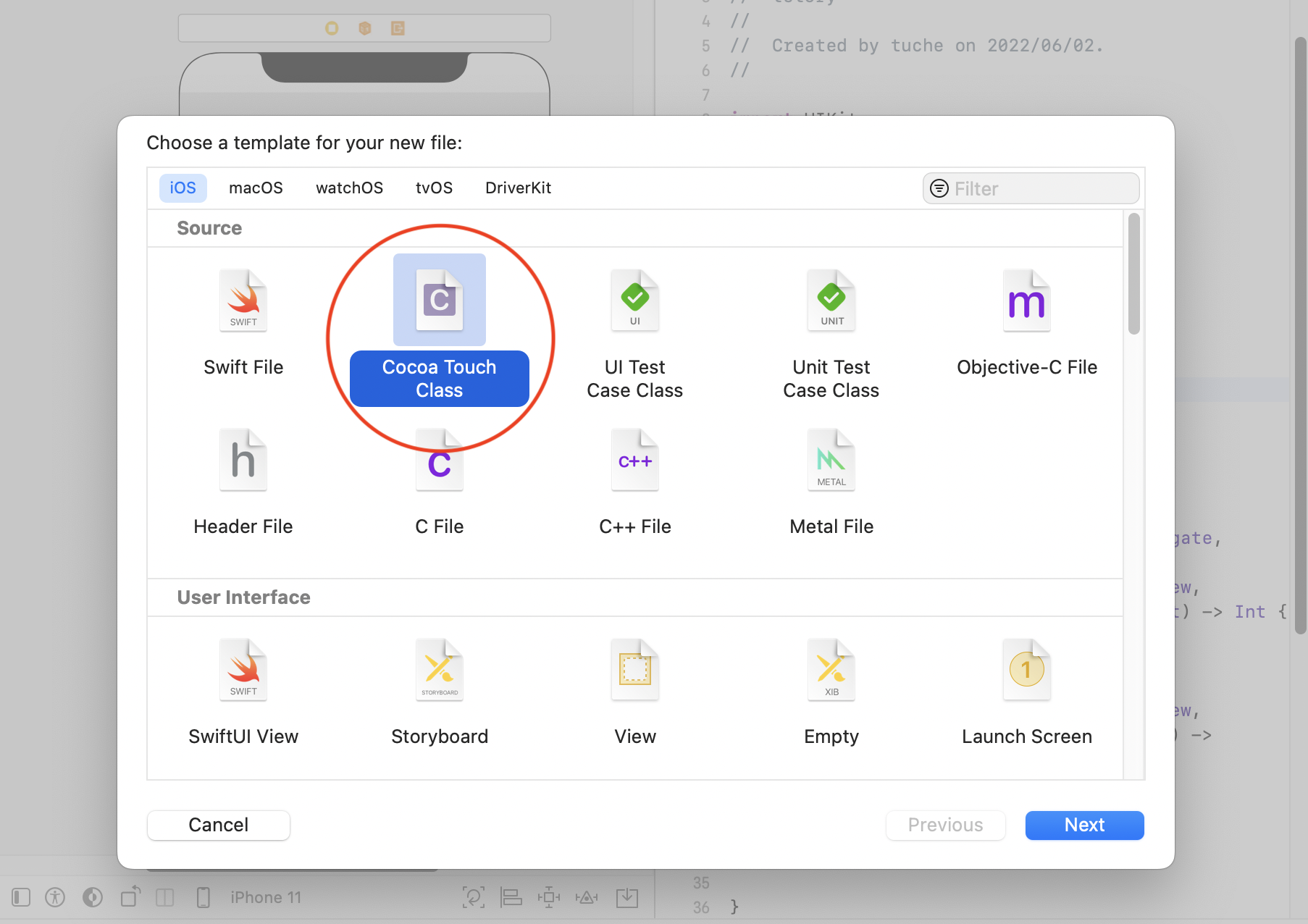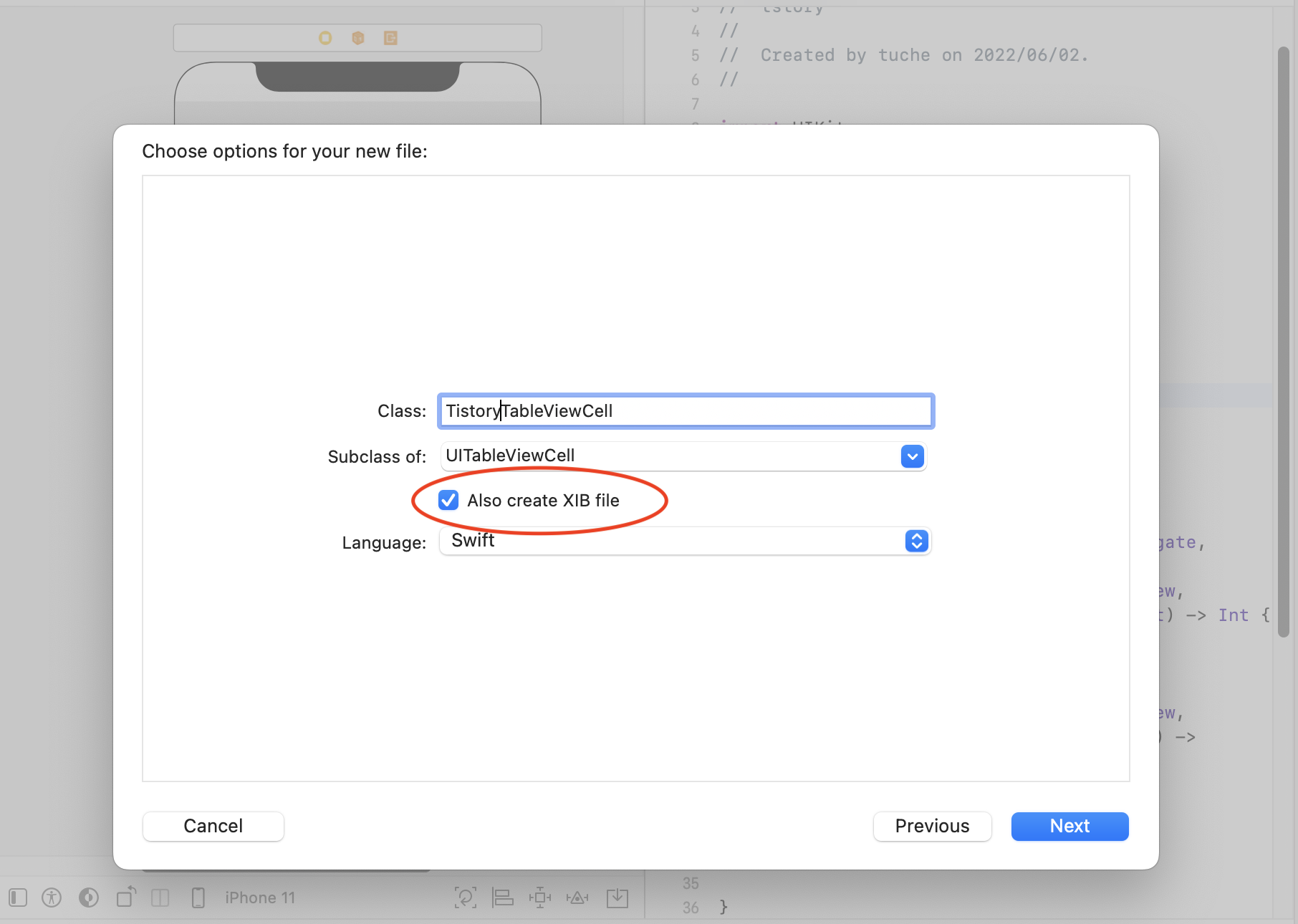 Cocoa Touch class를 만듭니다. 이 때에 XIB 파일도 같이 생성합니다.