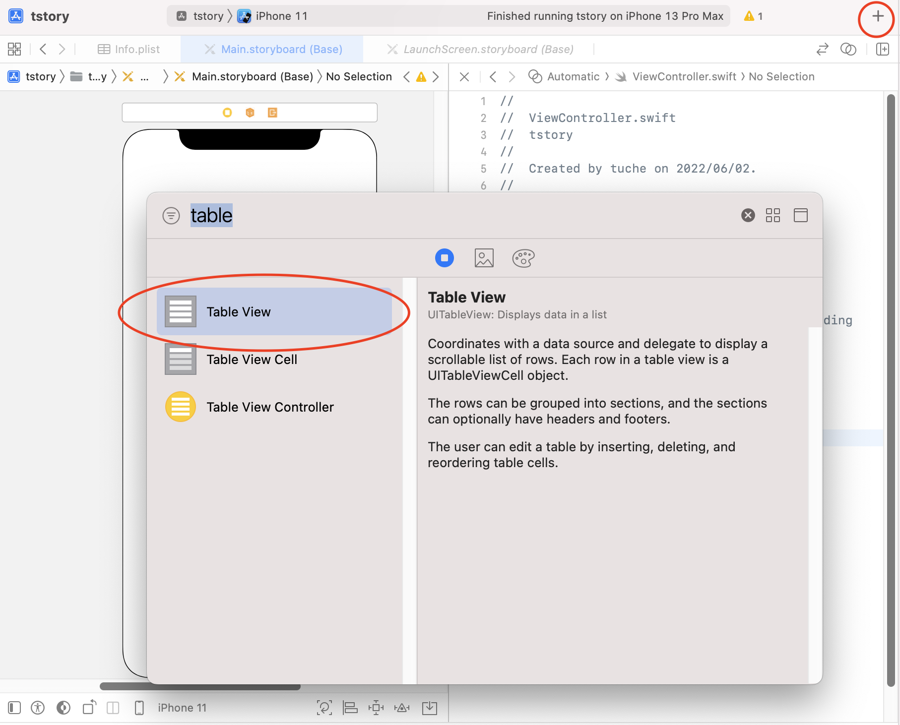 테이블뷰를 선택한 뒤 Storyboard에 드래그하여 올려줍니다.