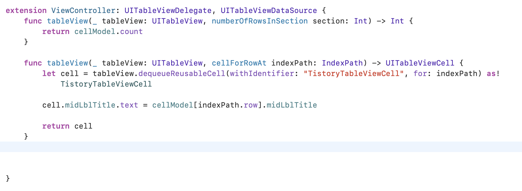 두번째 함수에서는 모델에 있는 title을 cell text에 지정합니다.