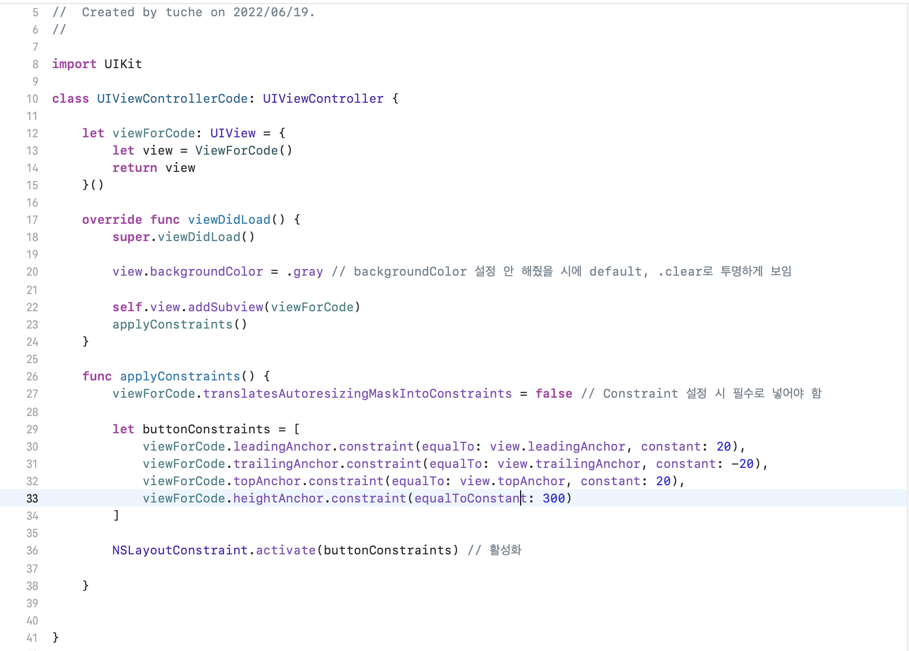 위 코드에서는 MyView를 생성하고, view에 추가해줍니다. 그리고, myView의 Constraints를 설정하여 가운데에 위치하도록 하였습니다.